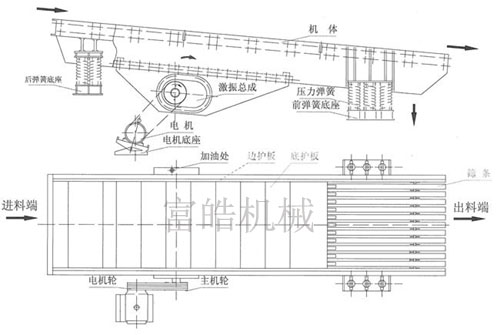 振動給料機是利用振動器中的偏心塊旋轉產生離心力,使篩廂、振動器等可動部分作強制的連續的圓或近似圓的運動。振動給料機是由給料槽體、激振器、彈簧支座、傳動裝置等組成。槽體振動給料的振動源是激振器,激振器是由兩根偏心軸(主、被動)和齒輪副組成,由電動機通過三角帶驅動主動軸,再由主動軸上齒輪嚙合被動軸轉動,主、被動軸同時反向旋轉,使槽體振動,使物料連續不斷流動,達到輸送物料的目的。
