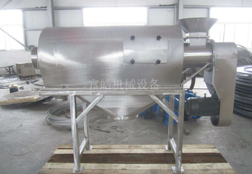 本設備篩網為圓筒狀,置于機體內,物料通過螺旋輸送系統后,和氣流混合、霧化進入網筒內;通過網筒內風輪葉片使物料同時受離心力和旋風推進力,從而迫使物料噴射過網,由細料排出口排出,不能過網的物料沿筒壁從粗料排出口排出。
