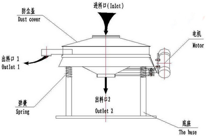 直排篩由振動電機、篩體、篩網、減振裝置及座架等組成,采用新型節能振動電機作振動源,固定在篩箱上兩臺相同的振動電機做相反方向自同步旋轉,振動電機所帶的偏心塊在旋轉時各個瞬間位置所產生的離心力之分力沿拋擲方向作往復運動,使支承在減振裝置上的整個篩體沿激振力方向作周期性往復振動,物料在篩面上沿直線方向作拋物線運動,物料從入料端落入篩網后,迅速前進、松散透篩,完成篩分作業,以合理匹配篩網達到篩分的目的。