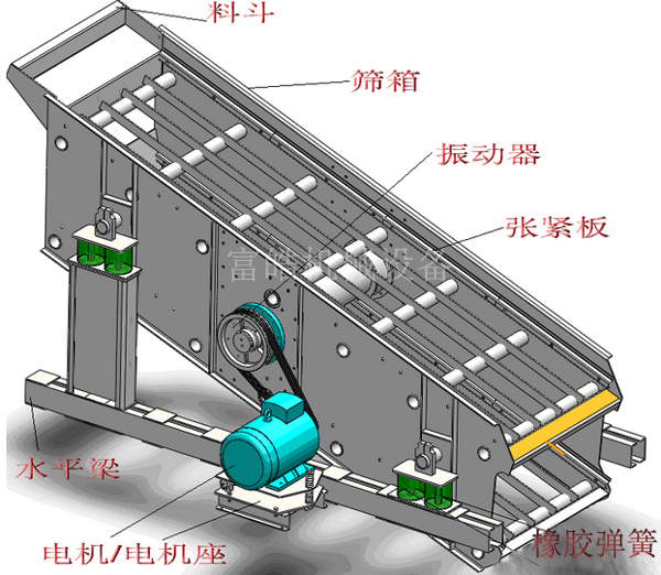 振動篩一般有振動器、箱箱、隔振裝置及傳動裝置等部分組成。各種振動篩具有長方形的篩面,篩面通過一定方式安裝在篩箱內,篩箱及篩面在振動器的作用下做具有特定軌跡的往復式運動,篩面的連續振動使篩面上的料層不斷被拋起、松散和分離,終達到分級或脫介的目的。